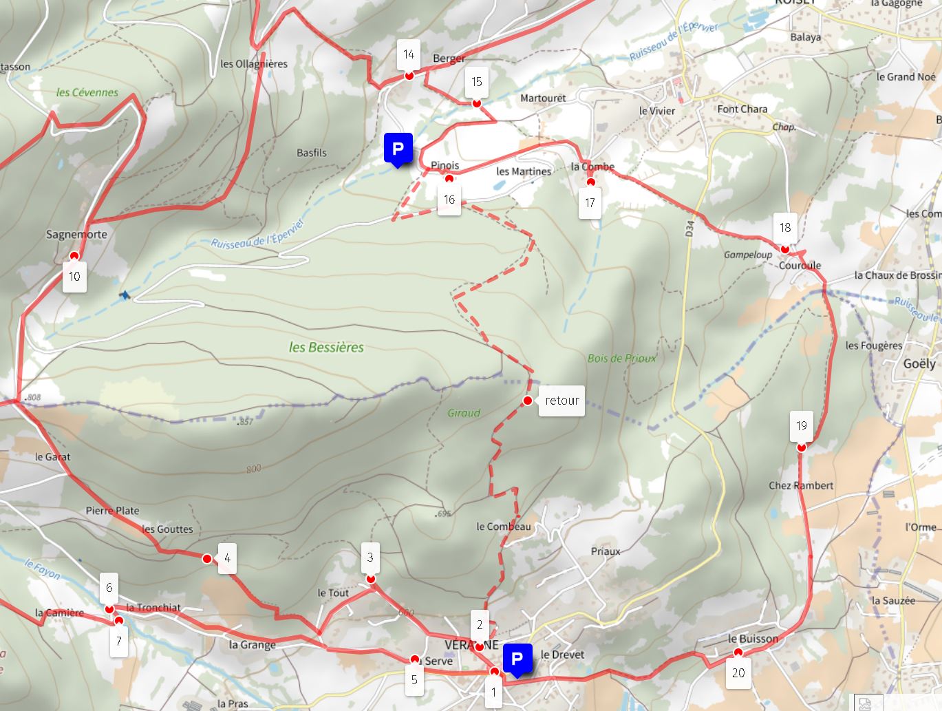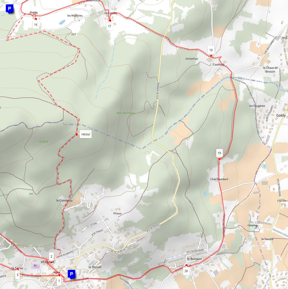 Circuit 6 - Au départ de la place de Véranne - Points n°: 1,2 3,4,10,14,15,16,17,18,19,20,1 - 13 km et 550 m de dénivelé.