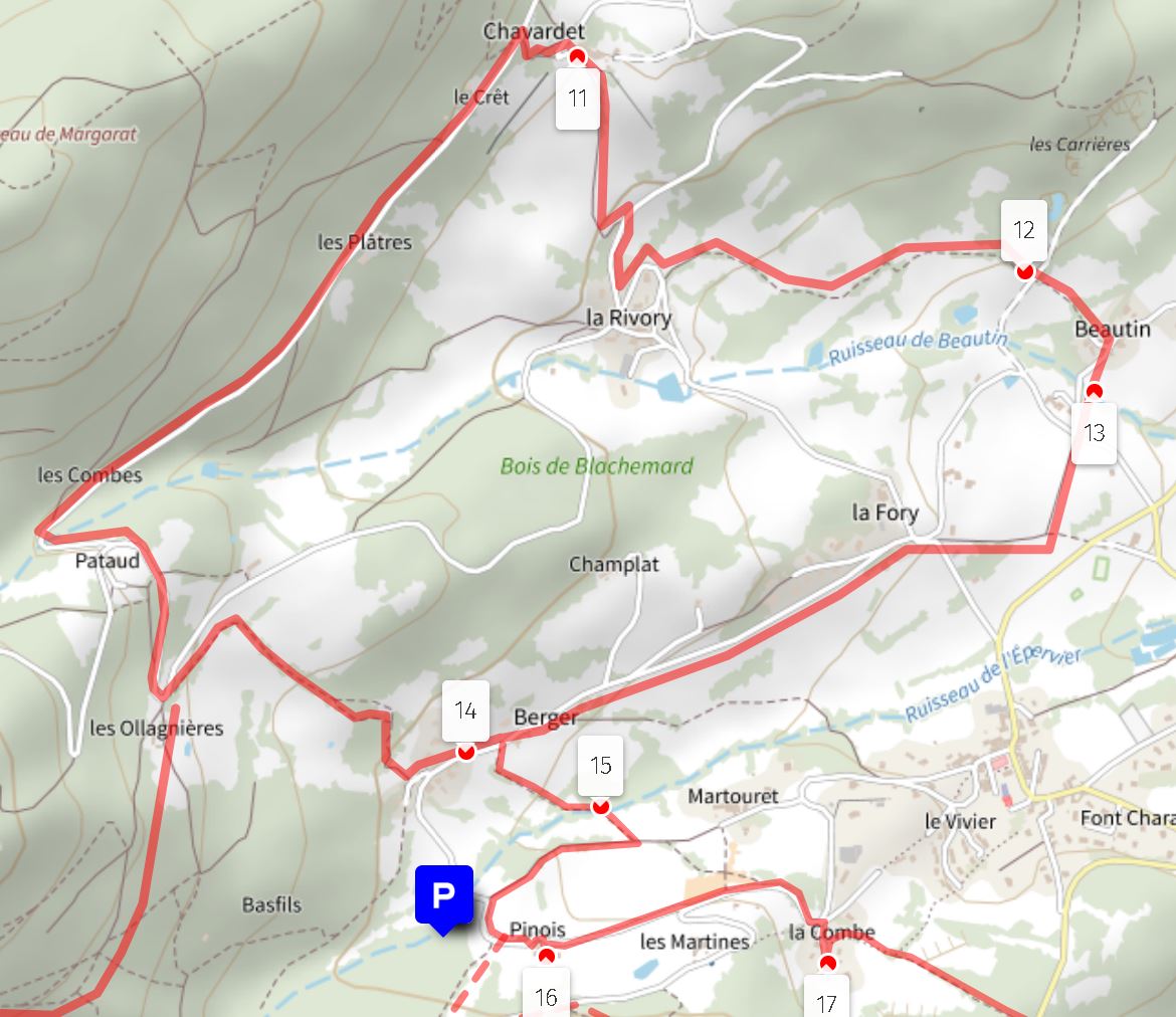 Circuit 4 - Au départ (P) de Pinois - Points n°: 16, 15, 14, 13, 12, 11, 14, 15, 16 - environ 8,5 km et 275 m de dénivelé.