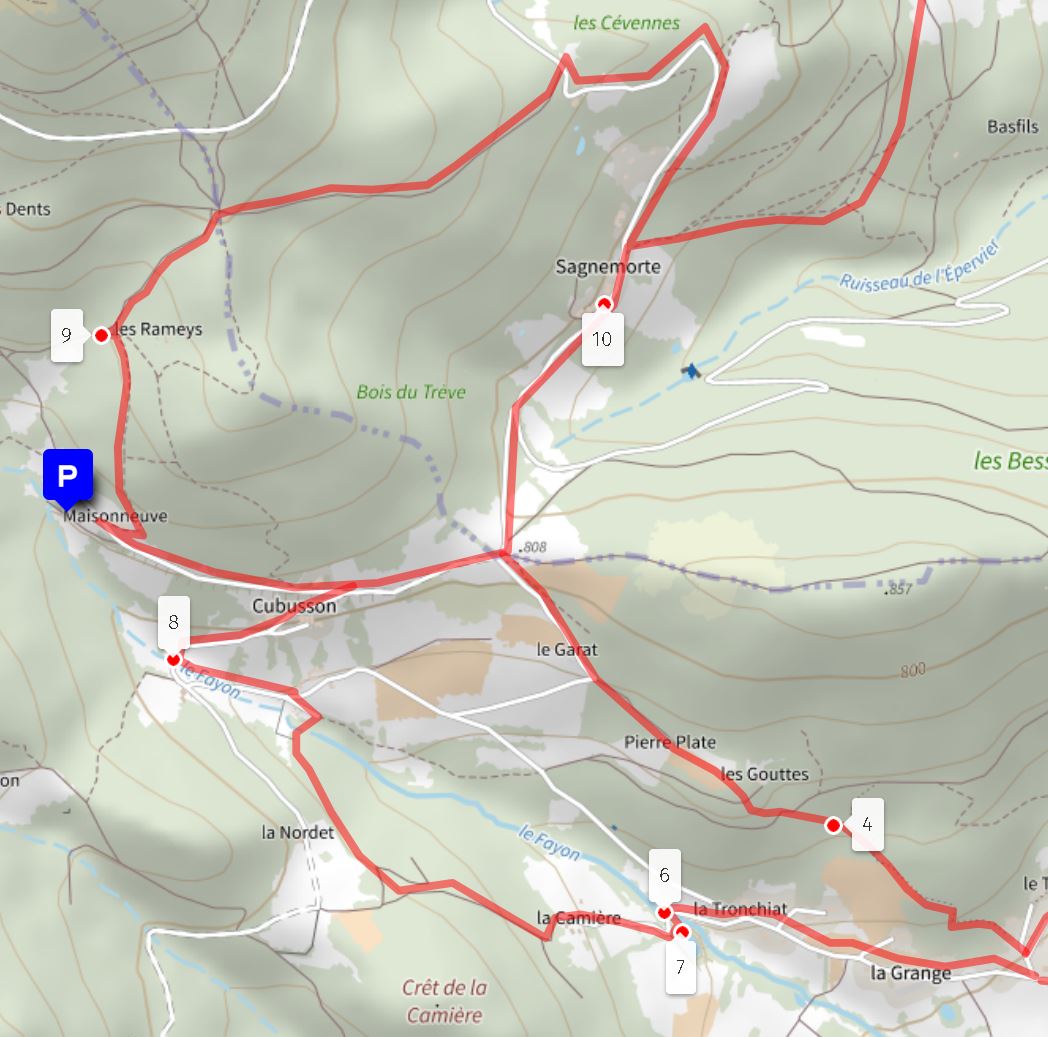 Circuit 3 - Au départ (P) du parking de Maisonneuve - Points n: 9, 10, 4, 7, 6, 8, 9 - environ 4,5 km et 210 m de dénivelé.