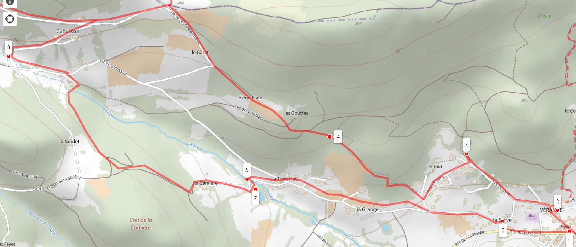 Circuit 1 - Au départ de la place de Véranne - Points n°: 1, 2, 3, 4, 8, 7, 6, 5, 1 - environ 6 km et 230 m de dénivelé.